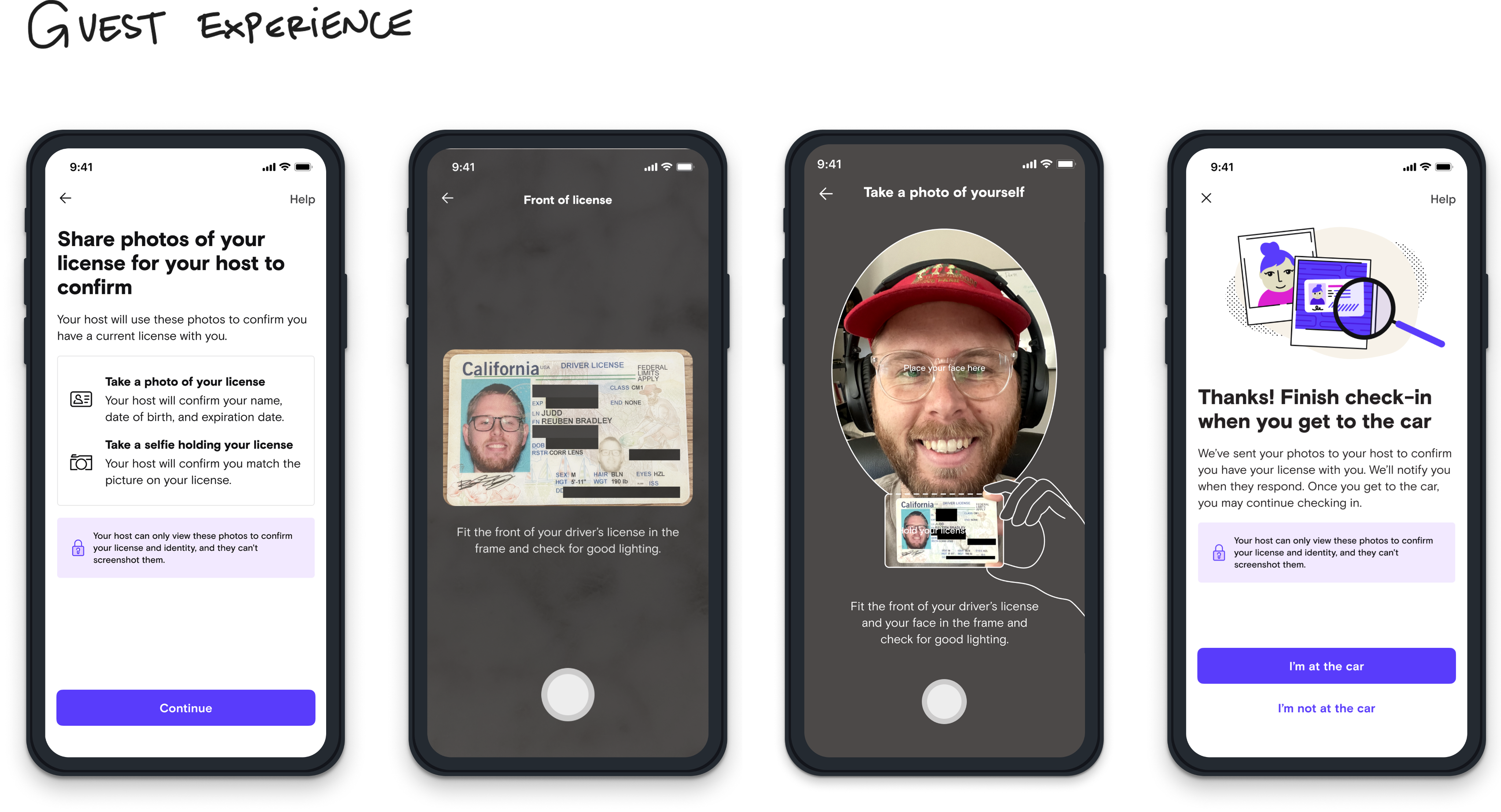 On each trip, a guest would be prompted to take both a selfie and a photo of their license and then we’d transmit these photos to their host who would confirm it matched what we collected when they booked.